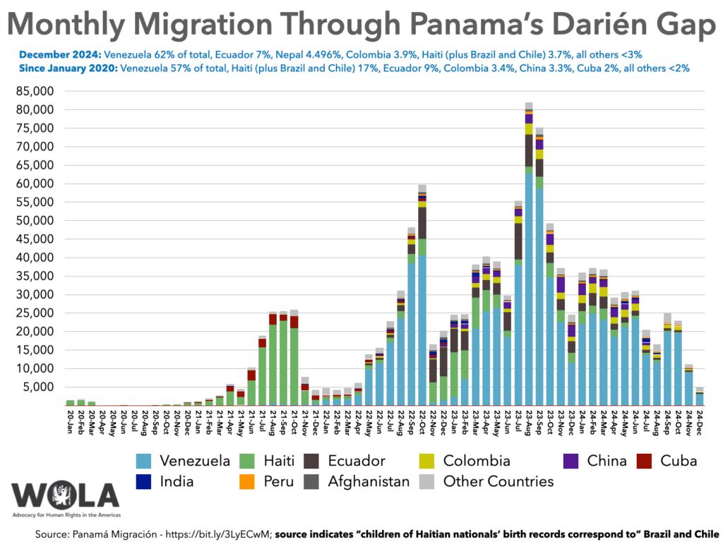 Though the number of people transiting dropped 42 percent from 2023’s record levels (from 520,085 to 302,203), 2024 was the second heaviest year ever for Darién Gap migration.