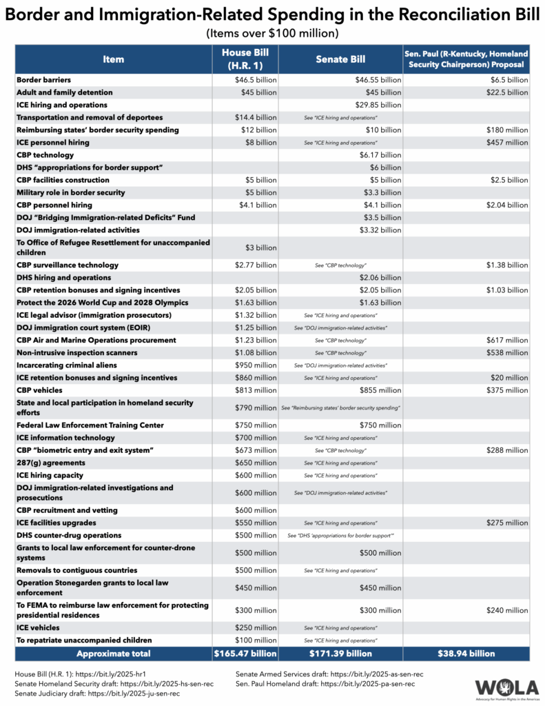 A May 22 WOLA analysis noted, “We have never seen anything come close to the level of border hardening and massive deportation enforcement resources foreseen in this bill.” It would enable the Trump administration to pursue the “mass deportation” plan, with vastly increased ICE detention and deportation operations, that is just getting underway, at current budget levels, in Los Angeles and elsewhere.