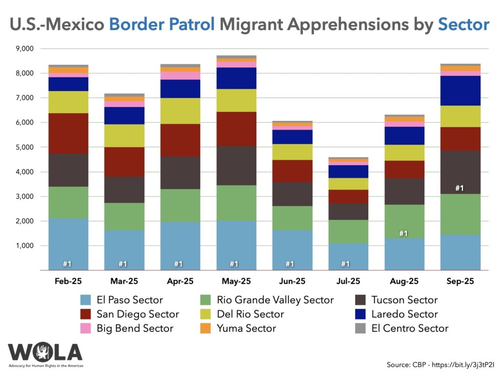 CBP’s September data also include the agency’s seizures of illicit drugs along the U.S.-Mexico border. WOLA’s next weekly Border Update will cover these trends, but it is worth noting that border seizures of fentanyl dropped 46 percent from fiscal 2024 to 2025. The drop, which may indicate a decline in overall cross-border flows, began in mid-2023, well before Donald Trump took office.