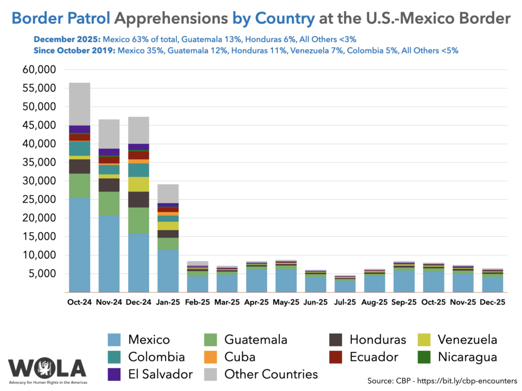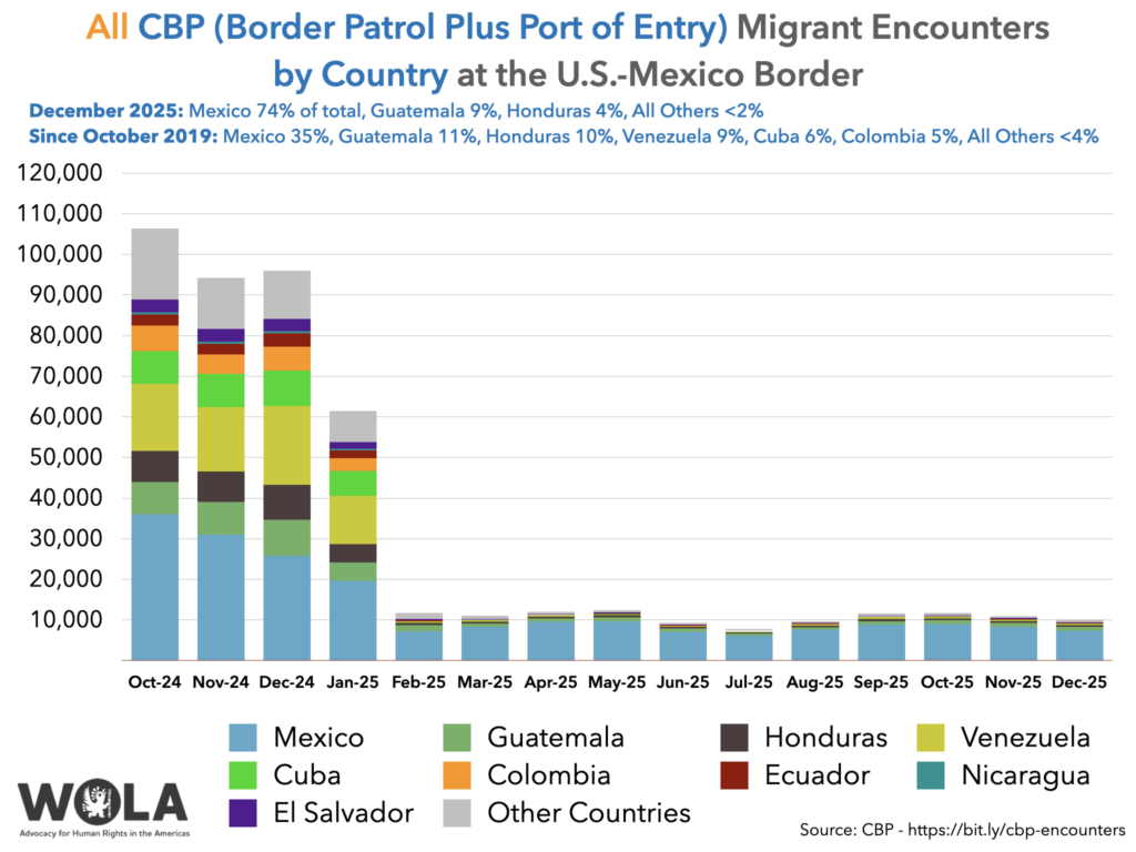 - December migration and drug-seizure data: CBP’s encounters with migrants declined slightly at the border between November and December. Amid a continued suspension of the right to seek asylum, the drop was likely seasonal. After a year and a half of declines, seizures of fentanyl have plateaued at the border. Seizures of cocaine are increasing, even after four months of lethal boat strikes in the Caribbean and Pacific.