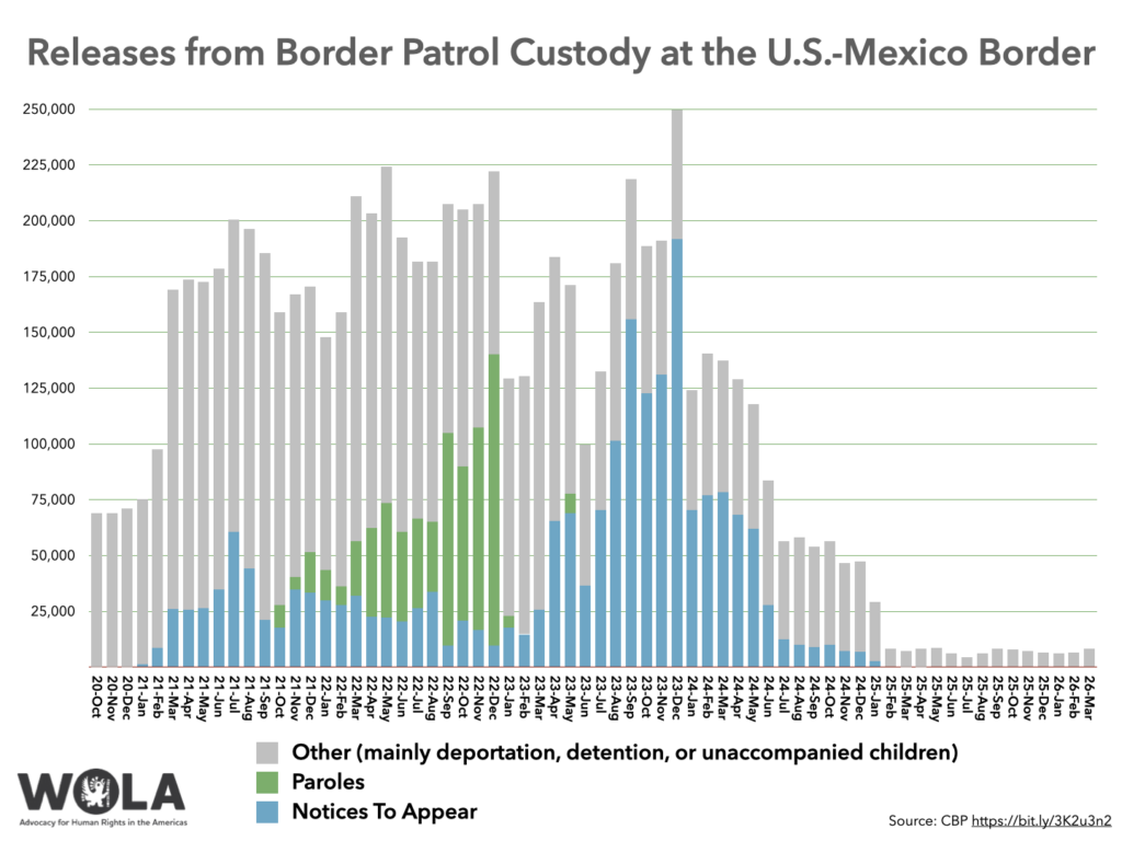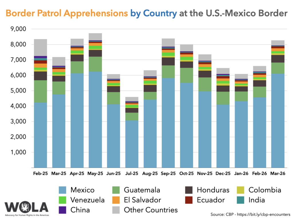 As noted in WOLA’s April 3 and earlier Border Updates, Senate Democrats have refused to support a 2026 appropriations bill that fails to include key human rights reforms to ICE and Border Patrol. These are “common sense” safeguards that are “what every police department uses and when you ask the American people, they’re on our side,” said Senate Minority Leader Chuck Schumer (D-New York). Negotiations, however, have stalled.
