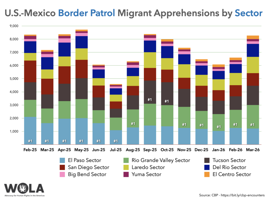 Notably, Border Patrol apprehensions increased 25 percent from February to March, from 6,598 to 8,268 people. As noted in WOLA’s April 3 Border Update, which reported a smaller January-to-February increase, this appears to reflect a seasonal pattern: non-asylum-seeking migration tends to increase in the spring and often in the fall, when the weather is milder, only to drop in the summer and winter. It is reasonable to expect further increases in Border Patrol apprehensions in April and May, followed by a drop.