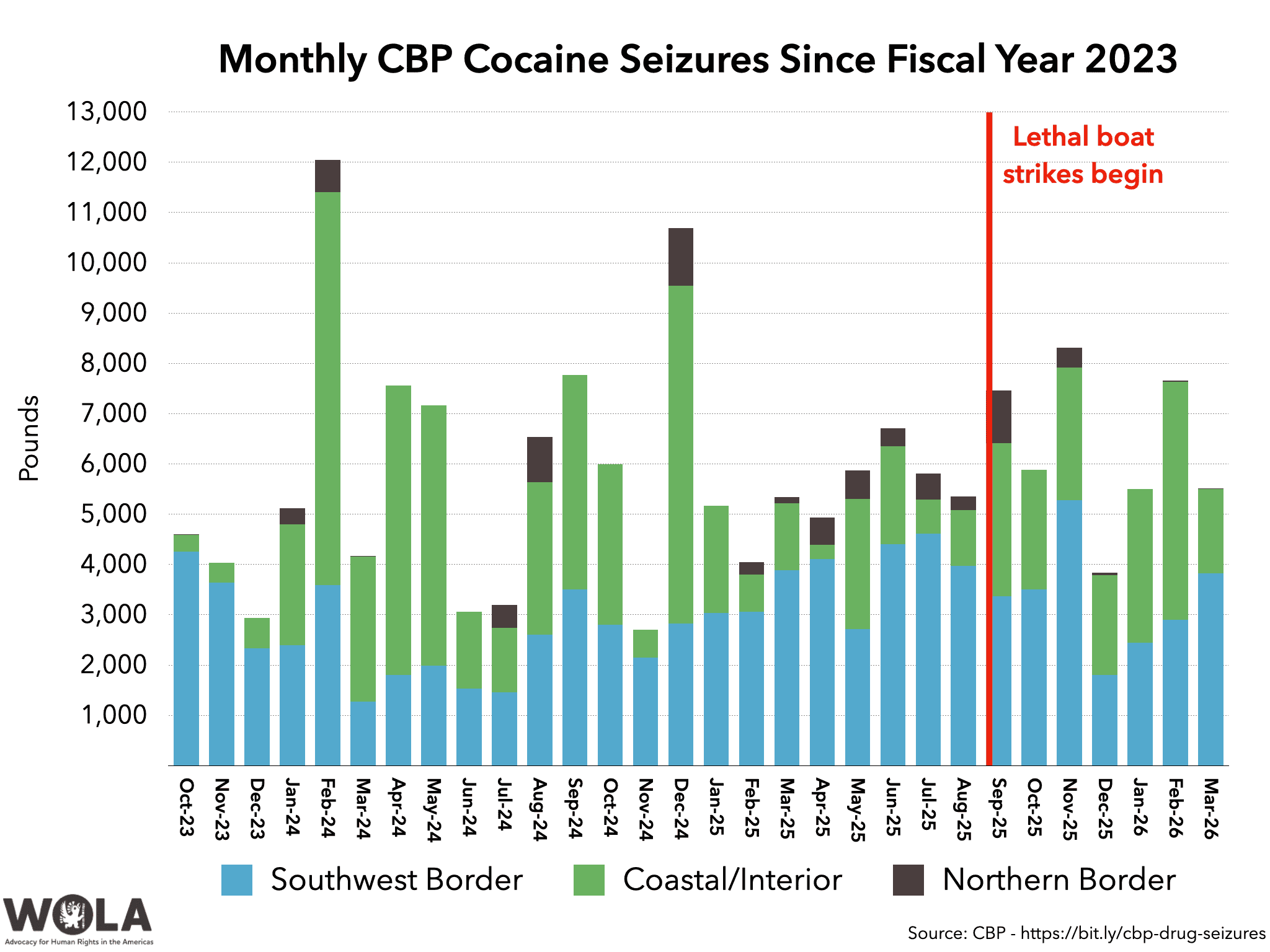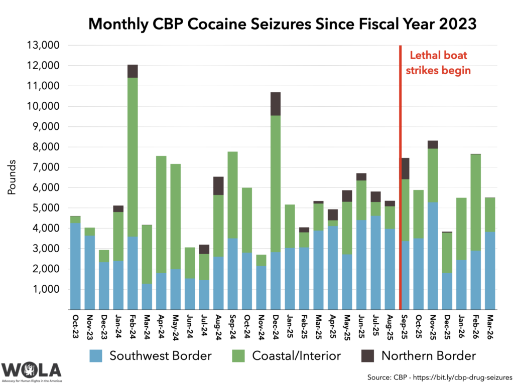Halfway through fiscal 2026, CBP’s cocaine seizures at all U.S. borders are just over half of 2025’s full-year total (36,700 pounds in the past six months versus 70,100 pounds all of last year). At the U.S.-Mexico border specifically, cocaine seizures are running at 97 percent of their 2025 pace (19,771 pounds versus 40,949 pounds all of last year).
