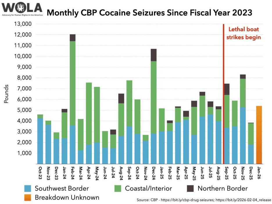 One partial indicator that is available, though, is Customs and Border Protection’s (CBP) seizures of cocaine at borders and along coasts, which the agency reports monthly. The CBP data are now current through January 2026. Five months and at least 131 extrajudicial killings later, CBP is finding at least as much cocaine as it did before.