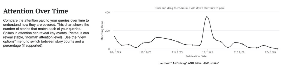 Search of mediacloud.org coverage of articles with the words “boat, drug, lethal, and strike” shows coverage slowing to a trickle in late January and early February.