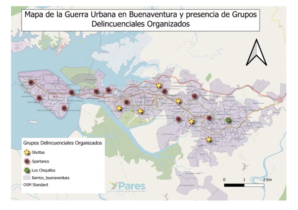 En 2016, el grupo armado y criminal organizado “La Local” dominaba las operaciones de narcotráfico en la ciudad y sus zonas fluviales. Los integrantes de La Local aterrorizaban a la población local, extorsionando negocios y secuestrando personas con fines de lucro. El grupo se fragmentó en 2019 luego de que la Policía Nacional capturara y encarcelara a sus líderes. Los desacuerdos sobre quién debía liderar la organización resultaron en la formación de dos facciones rivales, conocidas como los Shottas y los Espartanos. Ahora enemigos acérrimos, estas facciones se disputan los intereses comerciales ilícitos y el control territorial. Con más de 1.500 integrantes —principalmente jóvenes afrocolombianos— operan en 40 barrios y nueve veredas. Mientras tanto, los líderes de estos grupos controlan las operaciones desde las cárceles.