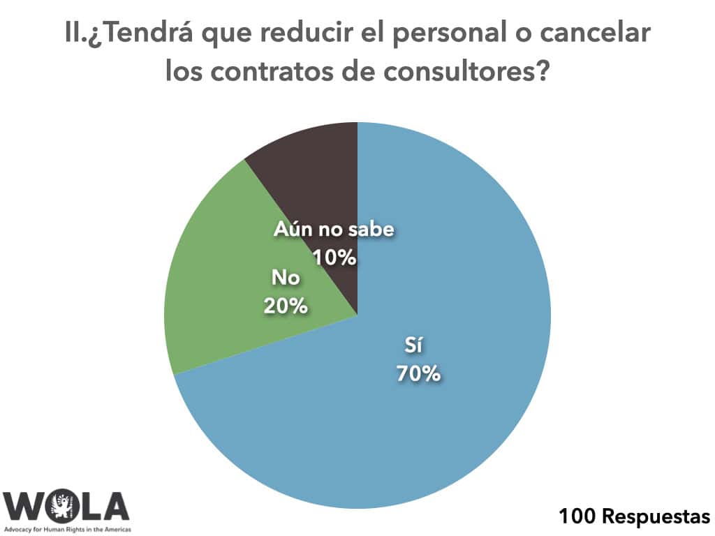 Como ilustran estos gráficos, la mayoría de las organizaciones que respondieron indicaron que tendrán que recortar proyectos y reducir personal. Algunas organizaciones dijeron que tendrán que cerrar completamente sus operaciones. Una sociedad civil vibrante es esencial en cualquier democracia saludable. Aparte del impacto en la prestación de servicios—desde la defensa de las víctimas de violaciones de derechos humanos hasta la protección de periodistas en riesgo, pasando por el apoyo a la población venezolana que ha huido de la crisis humanitaria y las violaciones de derechos humanos bajo el régimen de Maduro—el debilitamiento de la sociedad civil obstaculiza el desarrollo, la paz y la estabilidad a largo plazo en América Latina, así como los esfuerzos ciudadanos para exigir responsabilidades a los gobiernos y promover la democracia.