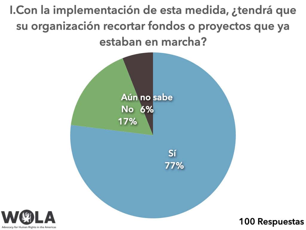 Una encuesta informal distribuida entre el 28 y el 30 de enero a las personas y organizaciones socias de WOLA sobre el impacto de la orden ejecutiva en las operaciones de grupos de derechos humanos, humanitarios y otras organizaciones de la sociedad civil en América Latina presenta un panorama sombrío del futuro cercano. Las organizaciones encuestadas representan una amplia gama de temas, principalmente autoidentificando sus misiones como trabajo con personas migrantes, solicitantes de asilo y refugiadas; defensa de los derechos humanos; promoción de la buena gobernanza y la transparencia; fortalecimiento de la sociedad civil; o los derechos de las mujeres.